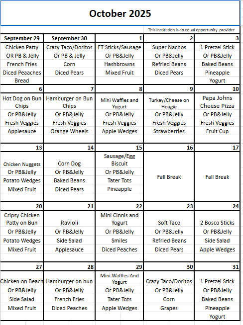 For questions about the menu or nutrition information, please contact the cafeteria manager, Brandy Collins, bcollins@evdio.org.